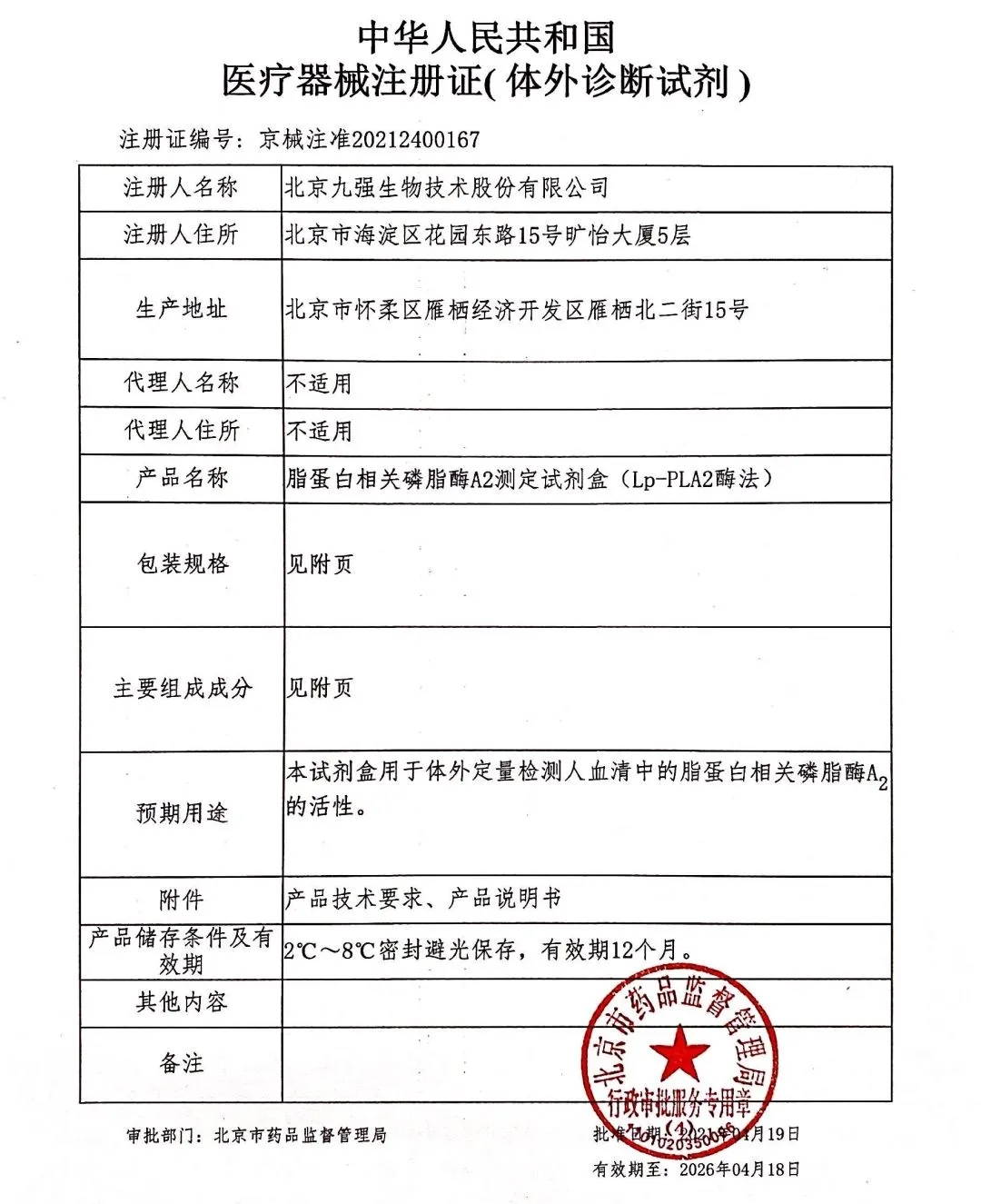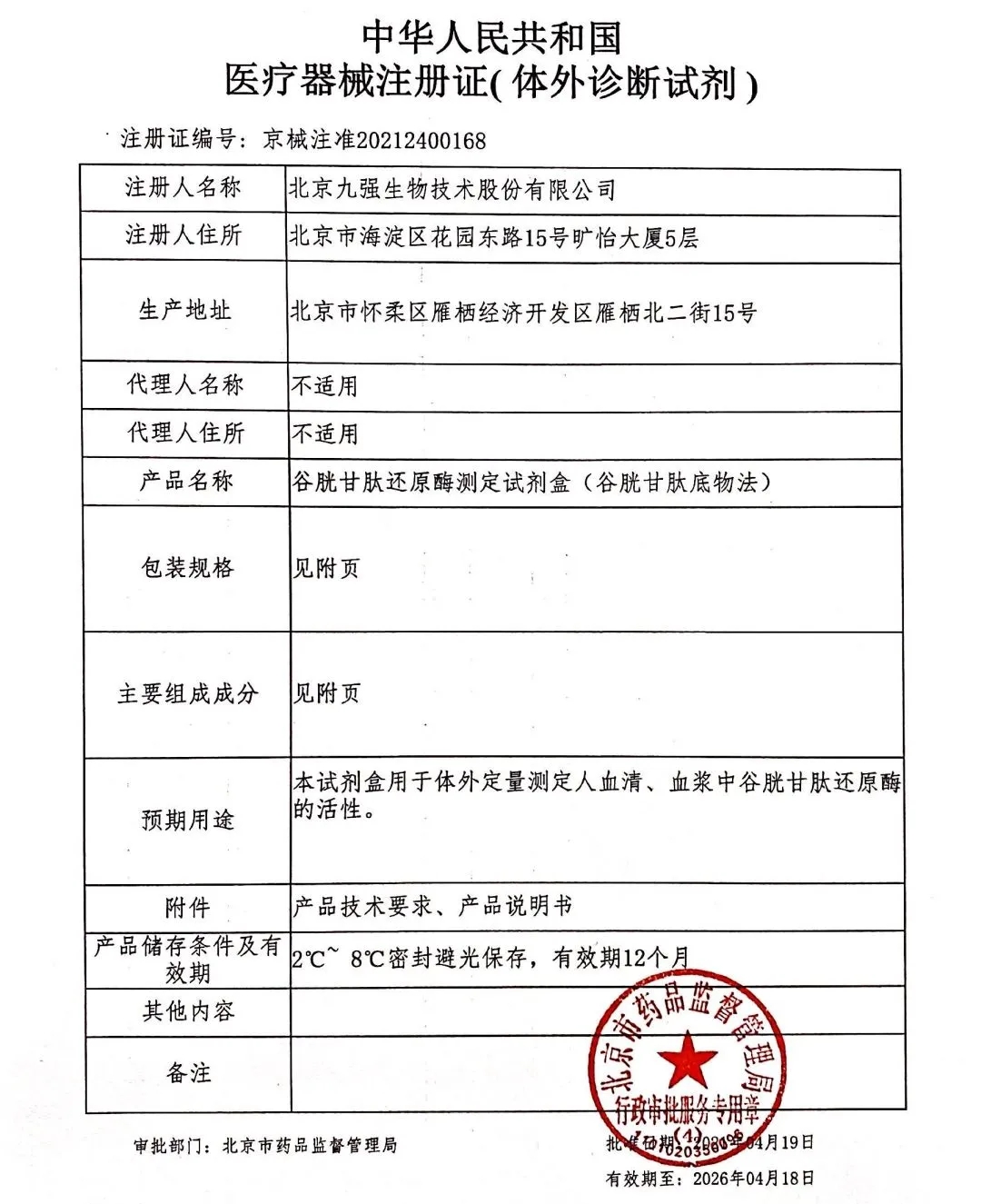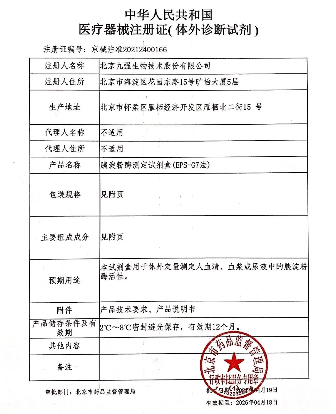 南宫体育(中国)顺利取得北京市药品监督管理局颁发的三项产品的《医疗器械注册证》:谷胱甘肽还原酶(液体)测定试剂盒(谷胱甘肽底物法)、脂蛋白相关磷脂酶A2测定试剂盒(Lp-PLA2酶法)和胰淀粉酶测定试剂盒(EPS-G7法)。