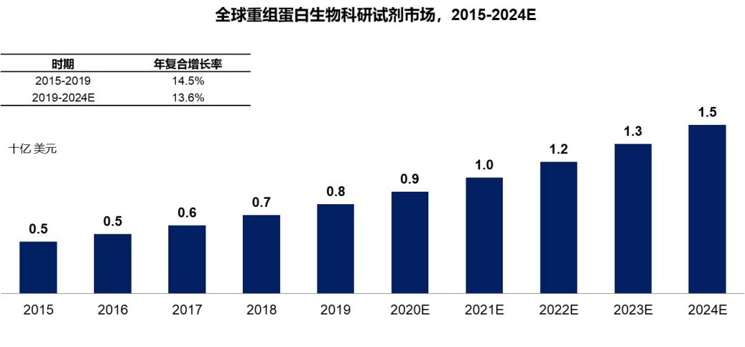 随着我国医药行业快速发展,重组蛋白市场迅速增长,市场规模或处于爆发前夜。根据Frost&Sullivan数据,随着对于生物药的积极研发和生命科学机理的深入探索,全球重组蛋白生物科研试剂市场从2015年的5亿美元增长到2019年的8亿美元,期间年复合增长率为14.5%。预计2024年市场规模将达到15亿美元(合人民币95.8亿),2019年至2024年间年复合增长率将达到13.6%。