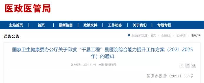 11月3日,国家卫生健康委印发《“千县工程”县医院综合能力提升工作方案(2021-2025年)(以下简称《工作方案》)。