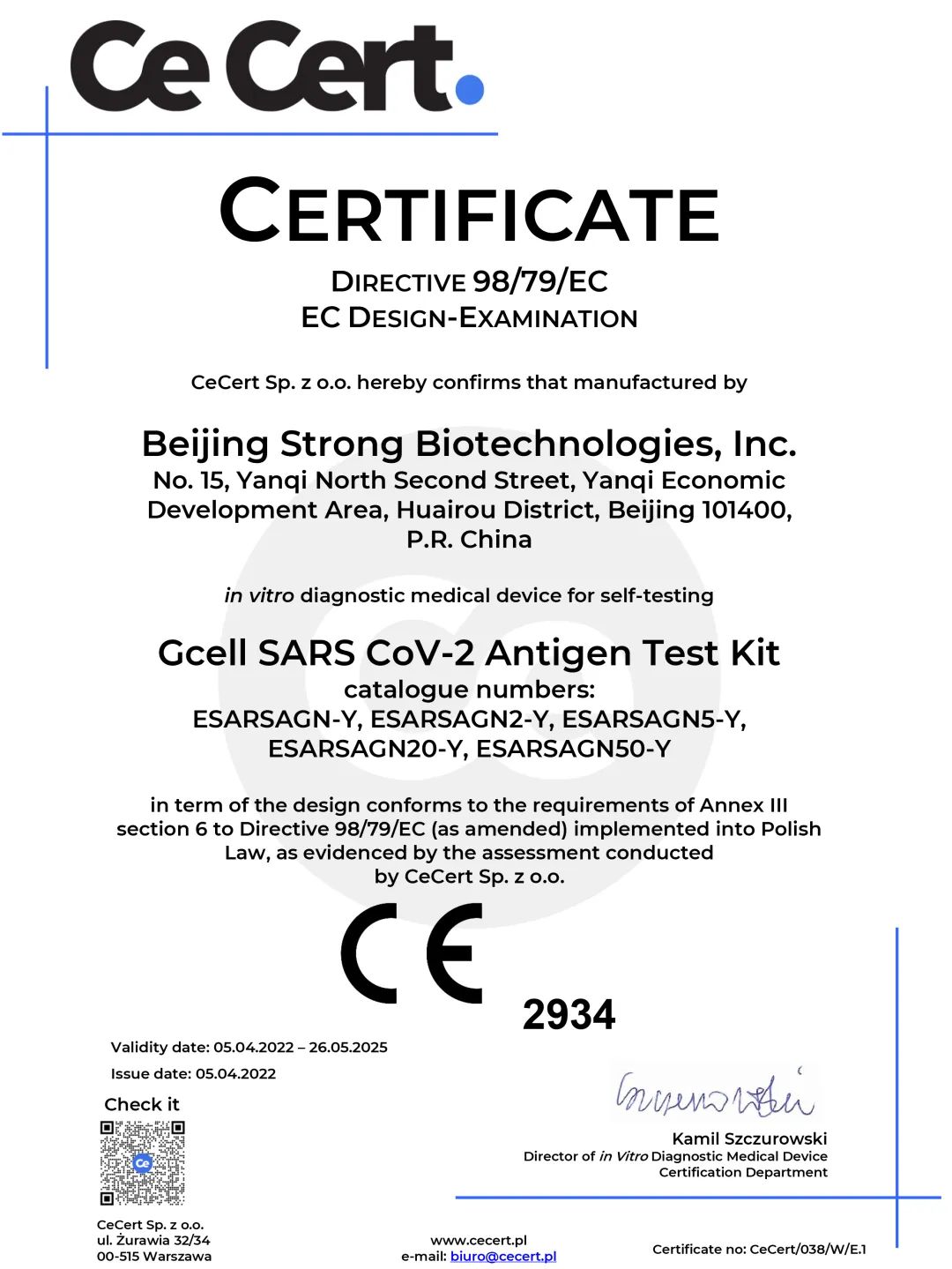 南宫体育(中国)新型冠状病毒抗原自测试剂盒(SARS CoV-2 Antigen Test Kit)于2022年4月5日取得欧盟CE准入资格!这意味着该自测试剂盒可在欧盟国家以及认可欧盟CE认证的国家进行销售。