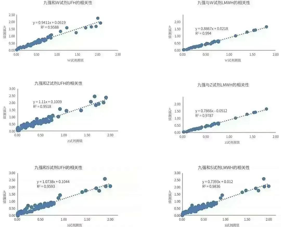 (1)国产抗Xa和对照试剂的测值的相关性良好:无论是普通肝素还是低分子肝素,测值相关性均在R2>0.95,可满足临床检测需求;