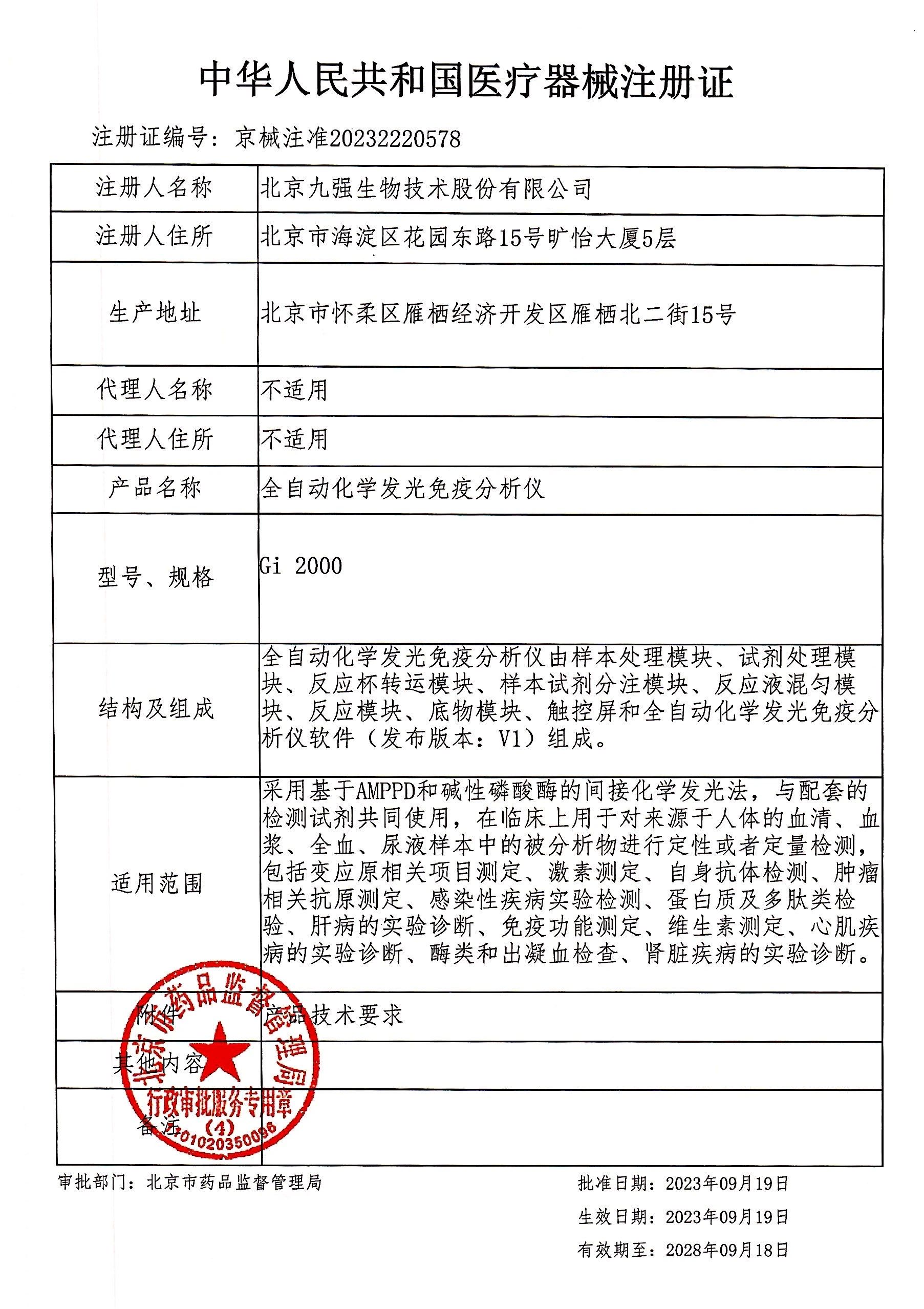 南宫体育(中国)Gi1600全自动化学发光免疫分析仪和Gi2000全自动化学发光免疫分析仪顺利获得北京医疗器械监督管理局颁发的《医疗器械注册证》,注册证号分别为京械注准20232220577、京械注准20232220578。