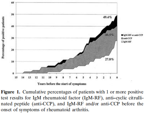 研究表明,Anti-CCP在患者首次RA症状出现前的14年前即可在血清中被监测到,且具有一定的预测价值[2]。