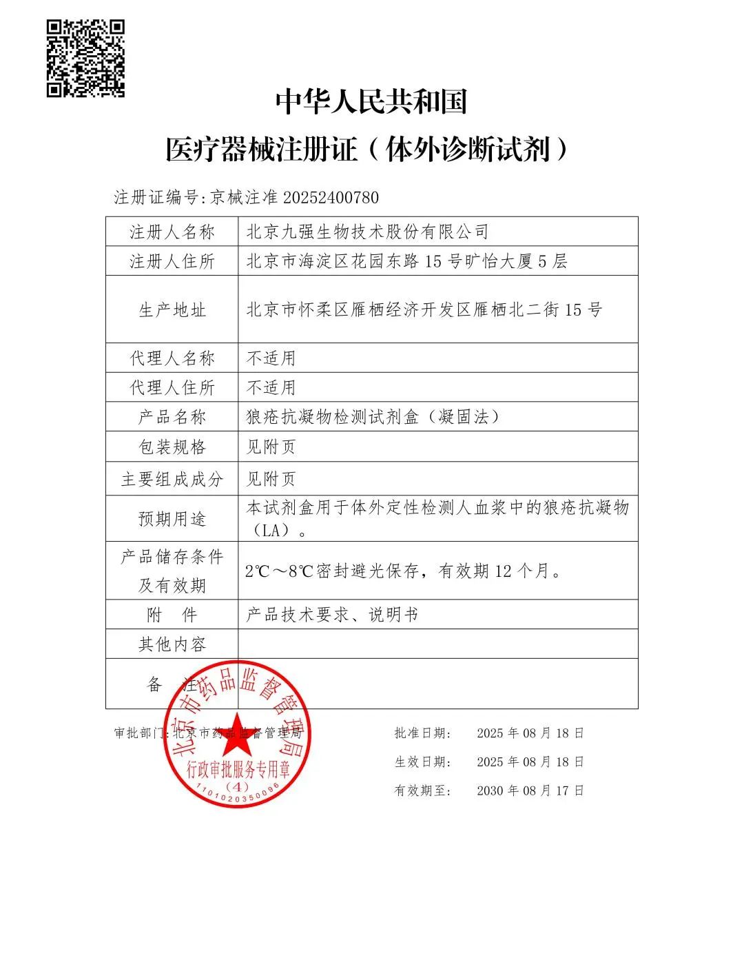 近日,南宫体育(中国)狼疮抗凝物检测试剂盒(凝固法)顺利取得国家药品监督管理局颁发的《医疗器械注册证》(注册证号:京械注准 20252400780)。