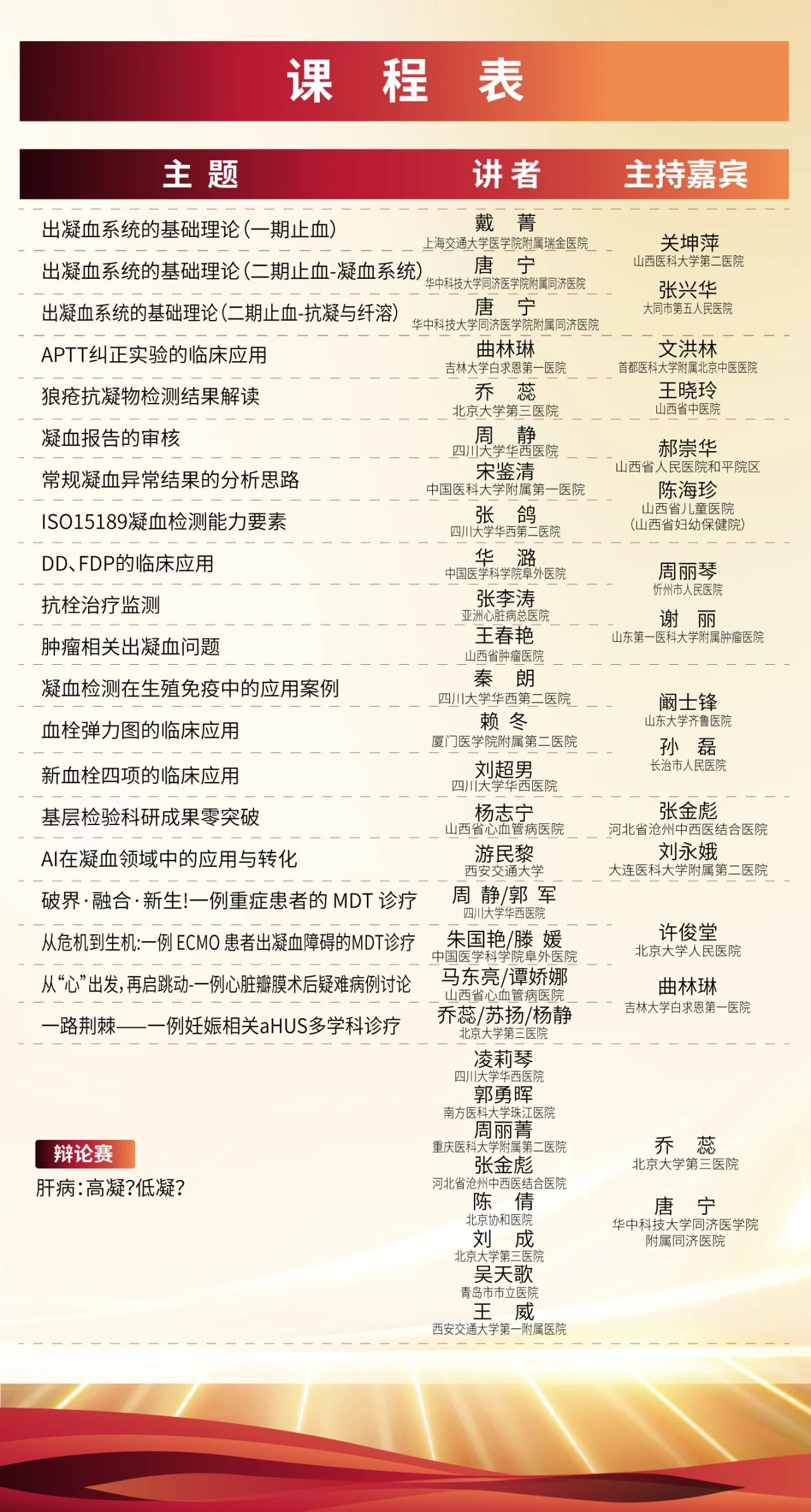 本次培训邀请国内凝血领域知名专家授课,课程内容涵盖出凝血系统基础理论、多学科联合诊疗(MDT)经典案例拆解,辩论赛以及AI在凝血领域的应用。